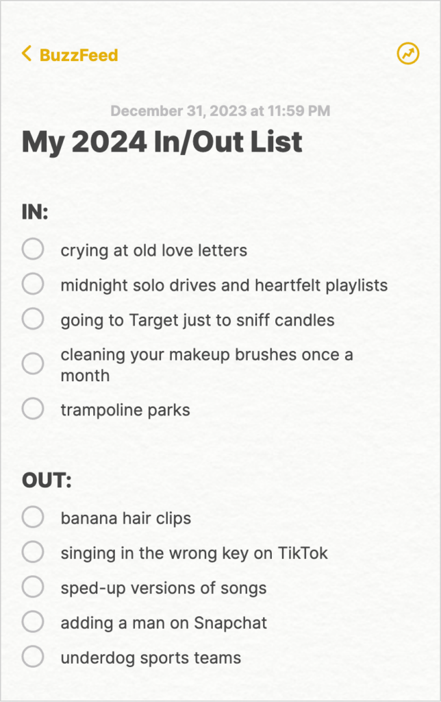 If you’re not sure where to get started buzzfeed has a fun In/Out list generator for you to try here.