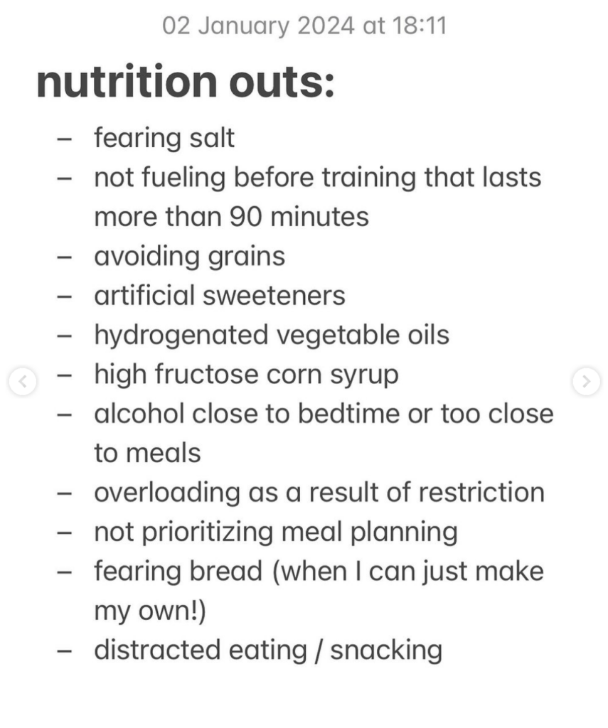 Here’s an example of a nutrition specific in/out list I found helpful from Conscious Katherine on Instagram.